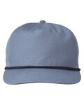 70% cotton, 30% nylon; 5-panel; Front panel lined; Half-moon mesh front panel insert; Semi-curved bill with contrasting rope; Contrasting snapback closure;